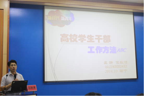 伍副院长以习近平总书记5月2日在北京大学考察时的重要讲话、中国共产主义青年团第十八次全国代表大会、习近平与团中央新一届领导班子成员集体谈话并发表重要讲话为引,希望全体学生干部能做到“爱国、励志、求真、力行”,“敢于有梦、勇于追梦、勤于圆梦”,他主要从什么是学生干部、学生干部的形象和作用、学生干部应具备的基本素质、如何当好一名学生干部、学生干部工作方法等五个方面展开讲座。他认为学生干部要立足服务师生,公正不偏心、实干不浮夸、勤奋不懒惰、文明不落俗、守纪不违规,起到模范带头、桥梁纽带、信息源等作用。学生干部要有较高的思想道德素质、较强的文化素质、较好的业务能力,同时,要讲究方法,加强调查研究,多请示、多汇报、多交流、多总结,这样才能事半功倍。