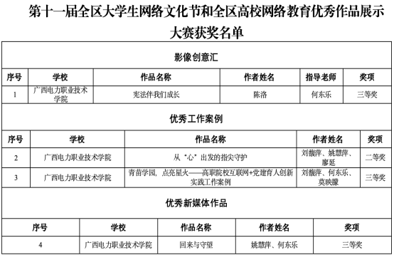 近日,自治区教育厅与党委网信办公布第十一届全区大学生网络文化节和网络教育优秀作品展示活动获奖名单。我院在影像创意汇、优秀工作案例、优秀新媒体作品赛道中共有4项作品获奖,其中二等奖1 项、三等奖 3 项,覆盖大学生网络文化创作与高校网络教育优秀作品两大领域,充分展现了我院师生在网络内容创作与思政教育融合方面的扎实实力。具体获奖成果如下:
