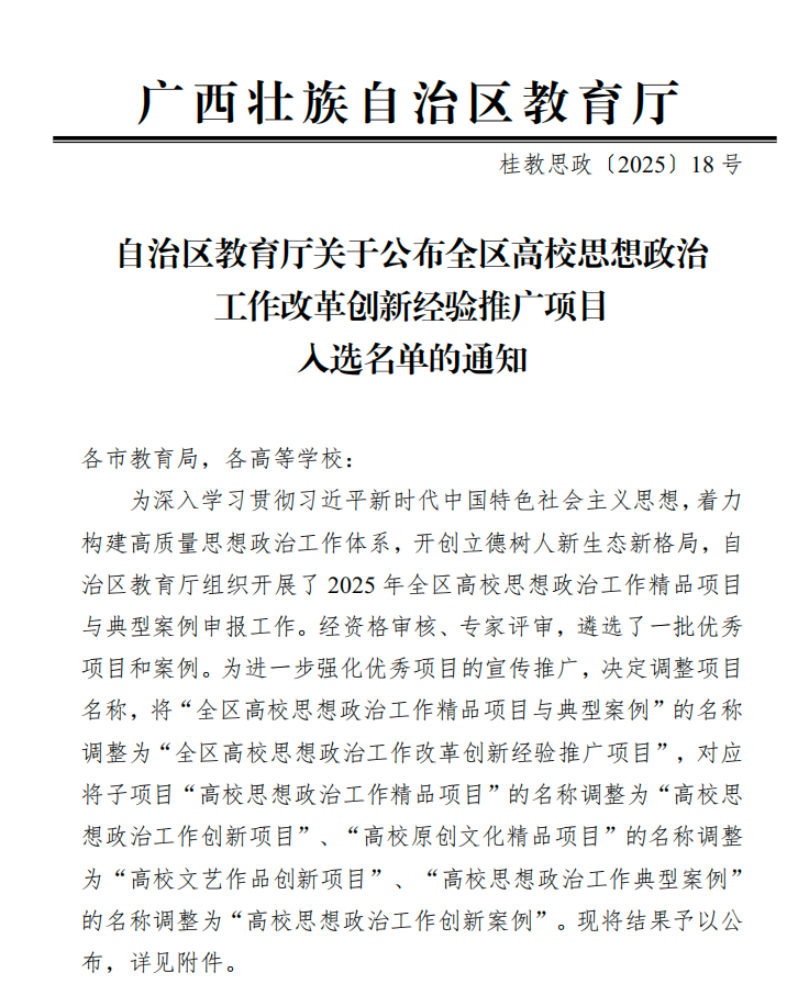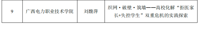 近日,自治区教育厅公布了全区高校思想政治工作改革创新经验推广项目入选名单,我院报送的项目成功入选。学院党总支书记刘馥萍主持申报的项目《织网·破壁·筑墙——高校化解“拒医家长+失控学生”双重危机的实践探索》入选高校学生心理健康教育指导创新案例。