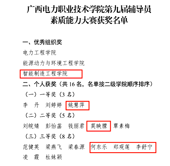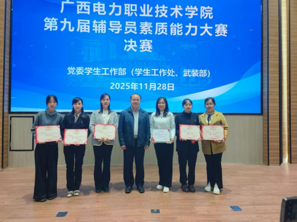 为推进学校辅导员队伍专业化、职业化发展,11月28日,广西电力职业技术学院第九届辅导员素质能力大赛顺利落下帷幕。我院辅导员姚慧萍荣获一等奖,莫映朦荣获二等奖,何东乐、郑观莲、李舒宁荣获三等奖,同时我院荣获“优秀组织奖”。充分展现了学院辅导员队伍过硬的专业实力与昂扬的精神风貌!