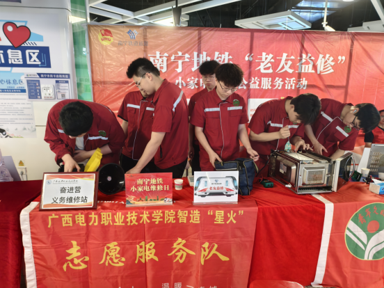 4月28日,由智能制造工程学院学生党支部、团委与南宁轨道交通运营有限公司联合主办的“老友益修”志愿服务活动,在广西大学地铁站内开展,来自学院志愿服务队的师生现场为市民免费维修微波炉、电风扇、电吹风等常用小家电。