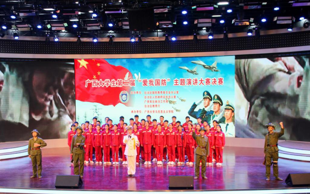 此次大赛由自治区国防教育办、自治区征兵办、广西军区政治工作局、自治区教育厅联合举办,自2018年7月份启动以来,全区77所高校大学生积极响应,经过全区初赛遴选,最终16所高校26组选手成功晋级决赛。由唐群老师、邱远望老师、邓雄月老师指导的作品《吃水不忘挖井人》讲述了1934年长征中的红三军第五师为突破蒋介石设置的第四道封锁线,红军重伤人员被国民党伙同当地土豪劣绅丢进酒海井里残忍杀害的悲壮历史,以及1981年5月越南军队入侵广西宁明县法卡山,中国人民解放军广西边防部队奋勇阻击越军,最终收复法卡山的感人事迹,讴歌中国共产党带领广西各族人民进行艰苦卓绝的革命,用血肉之躯换回了祖国的大好河山。我系王倍毓、梁崇毅、马逍遥、李建聪、左恒琨同学声情并茂的演讲,系欧米伽合唱团的激情悲壮的合唱让整部作品的情绪激昂,现场掌声不断,感动了在场的评委与观众。