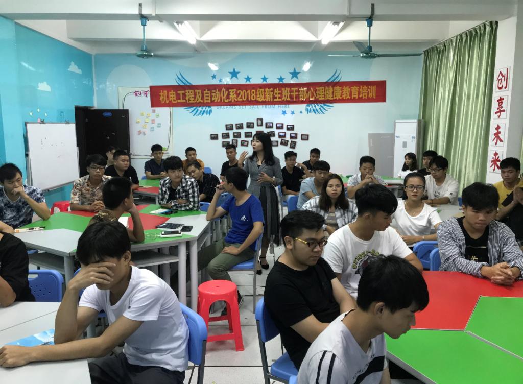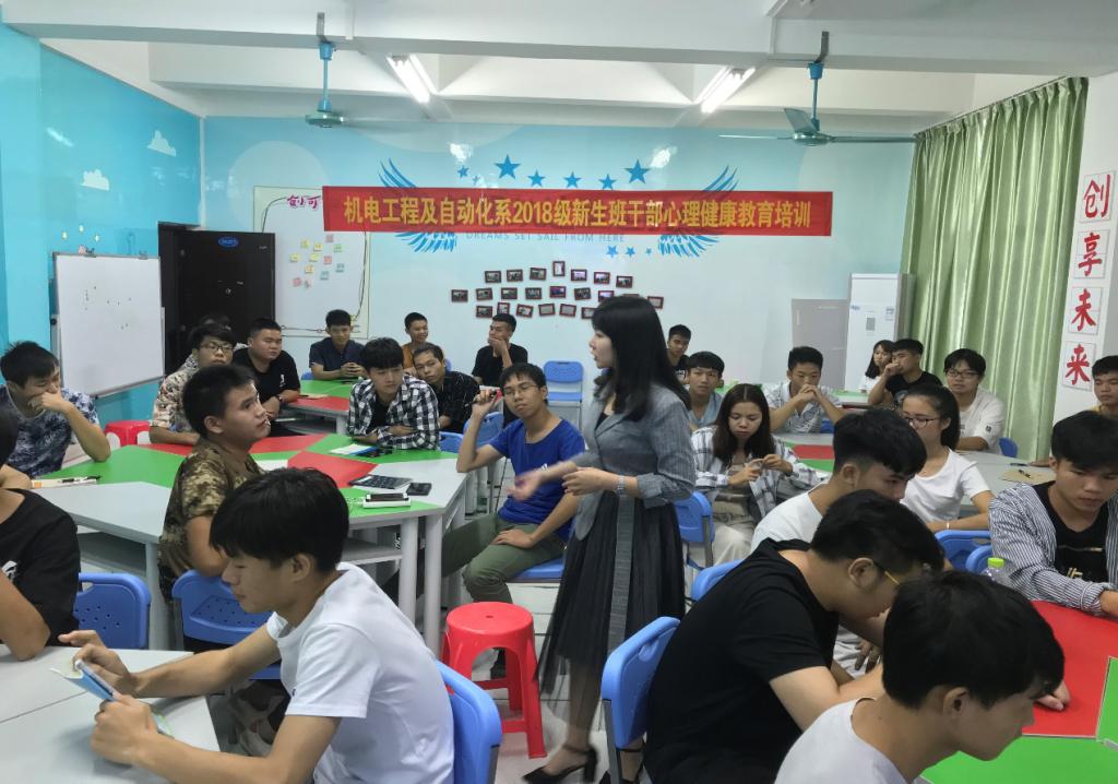 我系二级心理工作站于2018年10月31日下午16:30在学院3-207室对2018级新生心理委员、班长、治保委员等班干部开展第一期“机电工程及自动化系2018级新生班干部心理健康教育培训”,由副站长邓雄月老师主讲。